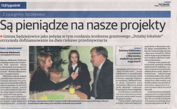 Drugi projekt pn. „Zatrzymane w kadrze”, realizowany będzie przez młodych dziennikarzy, w Zespole Szkół w Marzeninie. Miejscem działania będą trzy sołectwa: Marzenin, Pruszków oraz Bilew. Celem tego projektu jest aktywizacja społeczności lokalnej oraz stworzenie nowej, interesującej formy nauki dla młodzieży.![]()